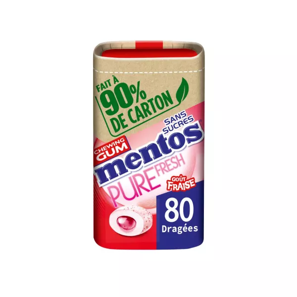 Édulcorants (xylitol, sorbitol, sirop de maltitol, mannitol, aspartame, acésulfame-K), gomme base, maltodextrine, acidifiants (acide malique, acide tartrique, acide citrique), fécule, rômes, stabilisant (glycérol), huile de noix de coco, émulsifiants (sucroesters d'acides gras, lécithines (soja)), jus de fraise en poudre (0,21%)*, épaississant (gomme de cellulose), extrait de thé vert, agent d'enrobage (cire de carnauba), antioxydant (E321), colorant (carmins). *Correspond à 3% de jus de fruit. Contient une source de phénylalanine.