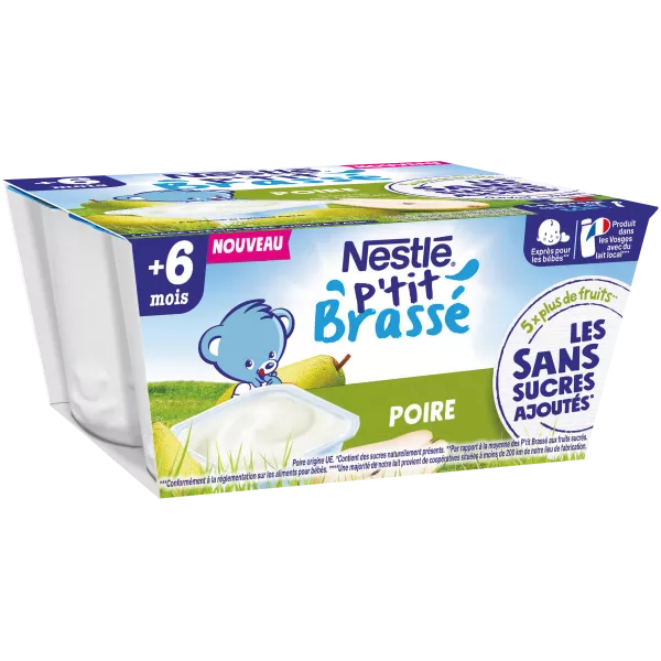 LAIT entier 64%, purée de poires 25% (poires, antioxydant acide ascorbique), eau, amidon de tapioca, protéines de LAIT, épaississant (pectine), ferments LACTIQUES, arôme naturel.