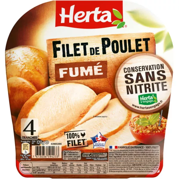 Filets de poulet, Sel, Bouillon de volaille et légumes (eau, LEMENT morceaux de poulet, sel, sucre, carottes, oignons, épices et aromates (ail, thym, EIRLFaurier, livèche, curcuma, paprika, poivre noir, muscade, clou de girofle), graisse de poulet, antioxydant: extrait de romarin), Sucre, Arômes naturels (acide ascorbique) Colorant: caramel ordinaire, Fumée. SANS GLUTEN. Conditionné sous atmosphère Sel 9 g protectrice.