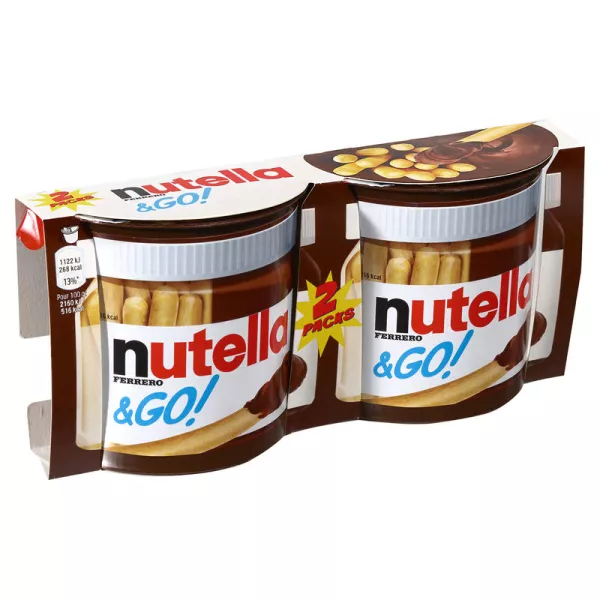 Suiker, palmolie, HAZELNOTEN (13%), magere MELKpoeder (8,7%), magere cacao (7,4%), emulgator: lecithine (SOJA), vanilline. BREADSTICKS Ingrediënten: TARWEbloem, palmolie, zout, GERSTEmoutextract, bakkersgist.