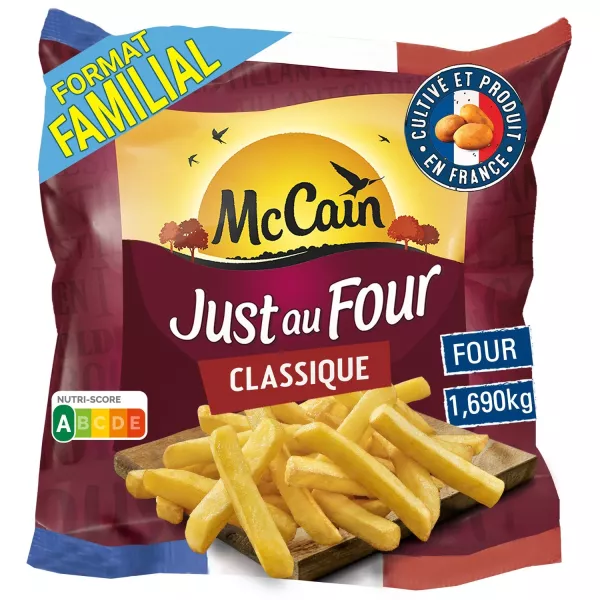 Pommes de terre (91,6%), enrobage (4,5%) [amidon modifié, farine de riz, dextrine, fibre de pois, épaississant: gomme xanthane, extrait de curcuma, protéine de pois, colorant: extrait de paprika], huile de tournesol (3,5%), sel (0,4%),