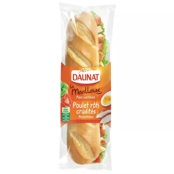 باغيت فيينا 53٪ (دقيق قمح ، ماء ، زيت بذور اللفت ، سكر ، بيض ، خميرة ، ملح ، جلوتين القمح ، دقيق القمح المملح ، خلاصة كرز هندي ، كركم) ، لحم دجاج مشوي معالج بالملح محضر في فرنسا 15٪ (لحم دجاج من الاتحاد الأوروبي الأصل ، الماء ، المحماض: لاكتات البوتاسيوم - أسيتات البوتاسيوم ، سكر العنب ، نشا البطاطس ونشا البطاطس المحول ، ملح ، مثبت: ثلاثي الفوسفات ، سكر بني ، مضادات الأكسدة: إريثوربات الصوديوم) ، خضروات نيئة 13٪ (طماطم 6.5٪ ، خس 6.5٪) ، مايونيز الخردل قليل الدسم 13٪ [زيت بذور اللفت ، ماء ، خردل ديجون 1.2٪ (ماء ، بذور خردل ، خل كحول ، ملح) ، صفار بيض ، نشا ، خل كحول ، سكر ، ملح] ، بيض 6٪. (النسبة المئوية المعبر عنها على المنتج النهائي). معلومات بالخط العريض لمن يعانون من الحساسية. الآثار المحتملة للحليب والأسماك والمحار والكرفس وبذور السمسم وفول الصويا والمكسرات.