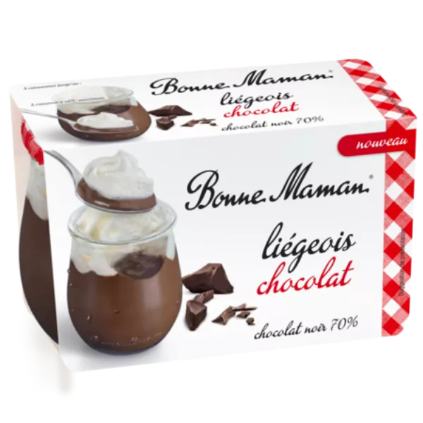 Lait entier frais 54%, crème fraîche 19%, sucre, oeufs entier frais, chocolat noir 4% (pâte de cacao, sucre, cacao maigre en poudre, émulsifiant : lécithine), cacao en poudre, fécule, arômes naturels de vanille, épaississants : pectines, carraghénanes (extrait d'algues)