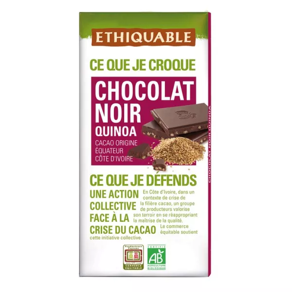 Pâte de cacao 52,4% *, sucre de canne* , beurre de cacao* , billettes de quinoa soufflé * 8%. Cacao: 65% minimum dans le chocolat. °issus de l'agriculture biologique *issus du commerce équitable (100% du poids total) Peut contenir des traces de fruits à coque, lait, gluten et sésame.